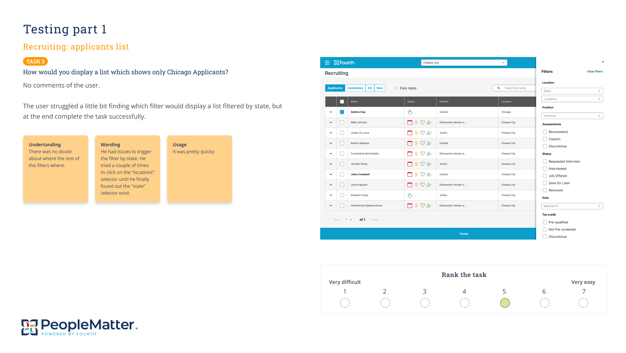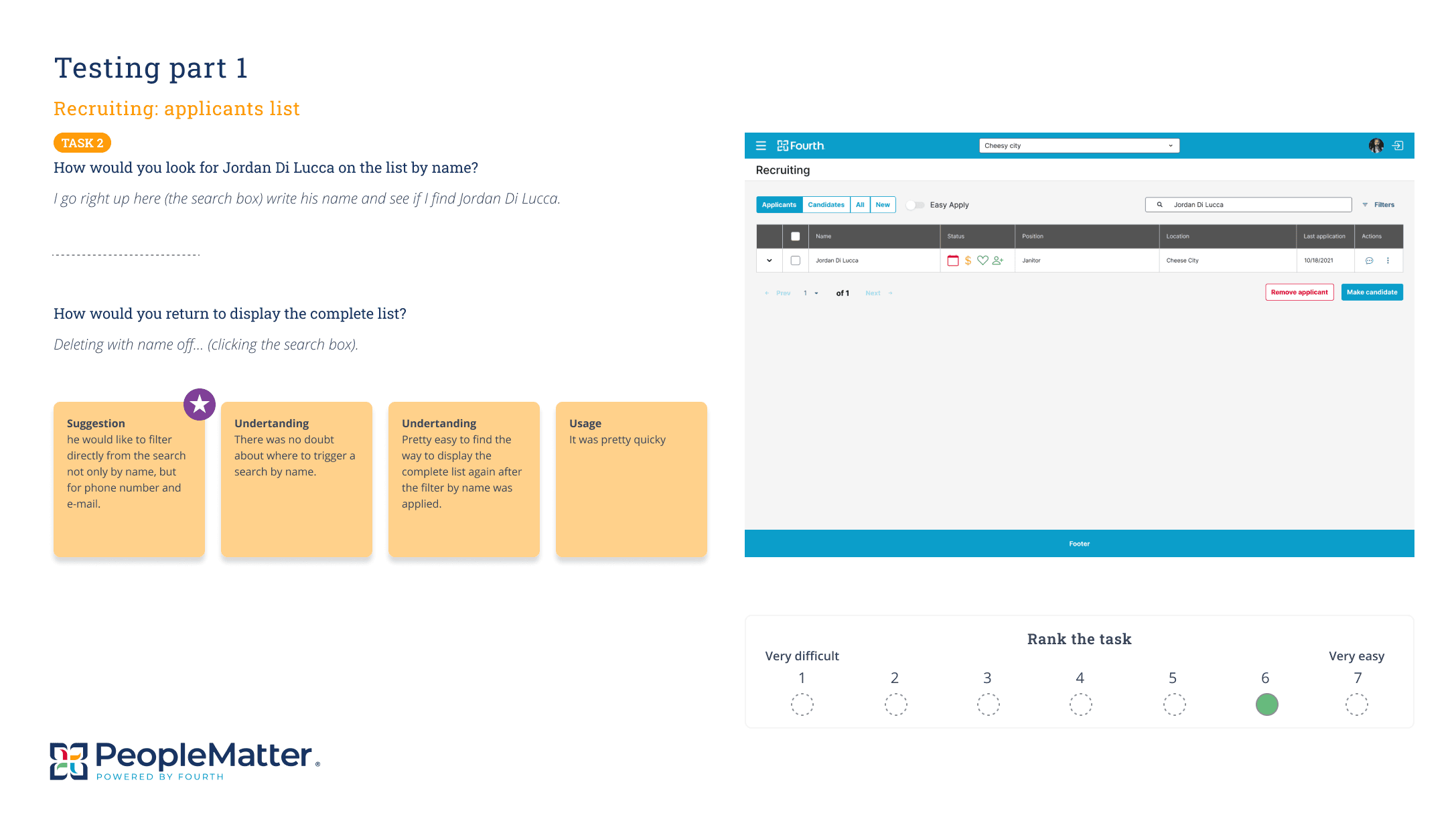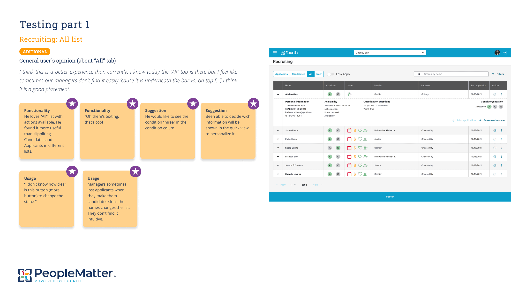 Next, in collaboration with the researcher assigned to People Matter, we planned how to fill those gaps. We organized several user testing, card sorting, and interview sessions with users in different recruiting roles, including recruiting managers and recruiters.